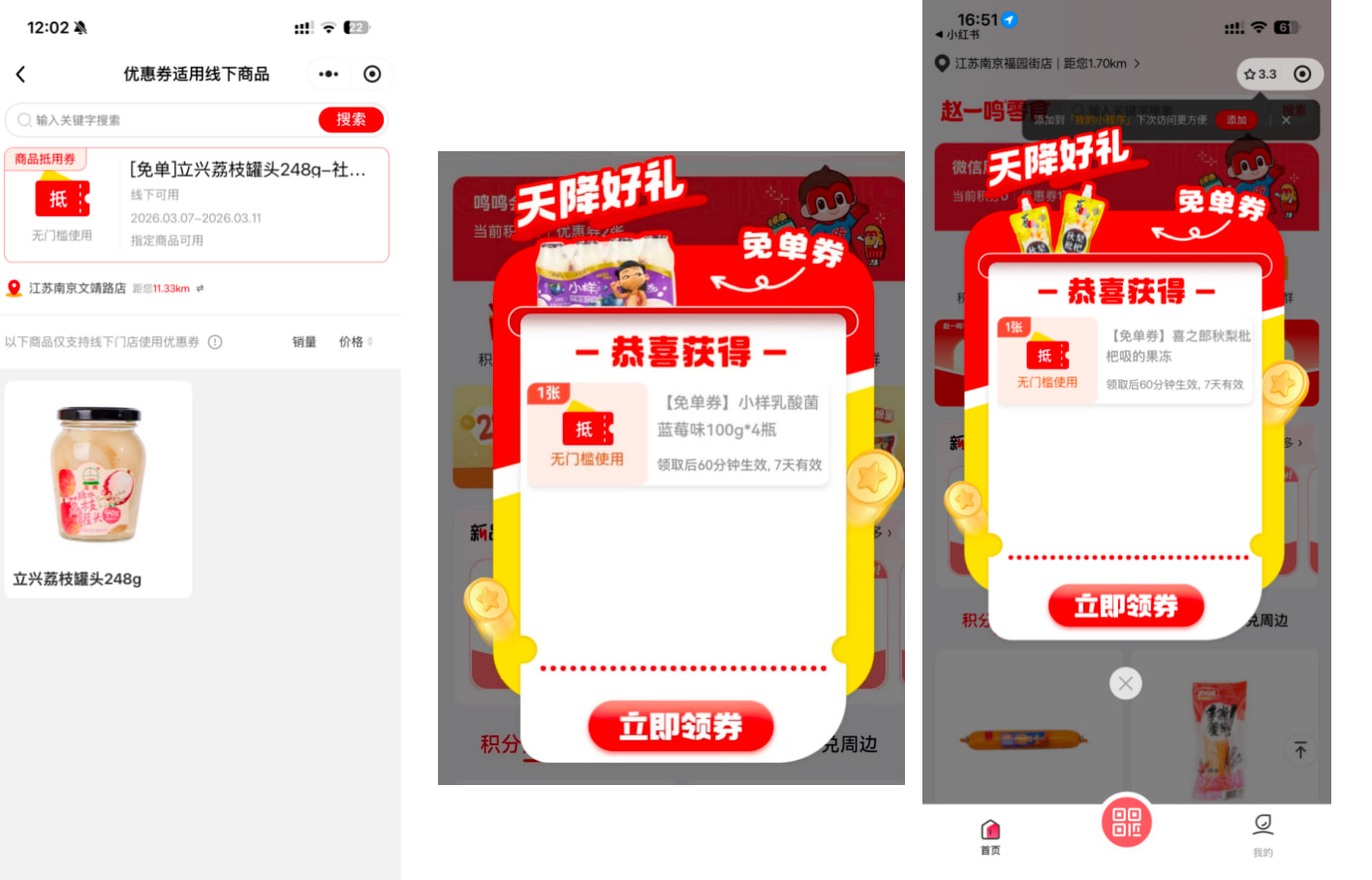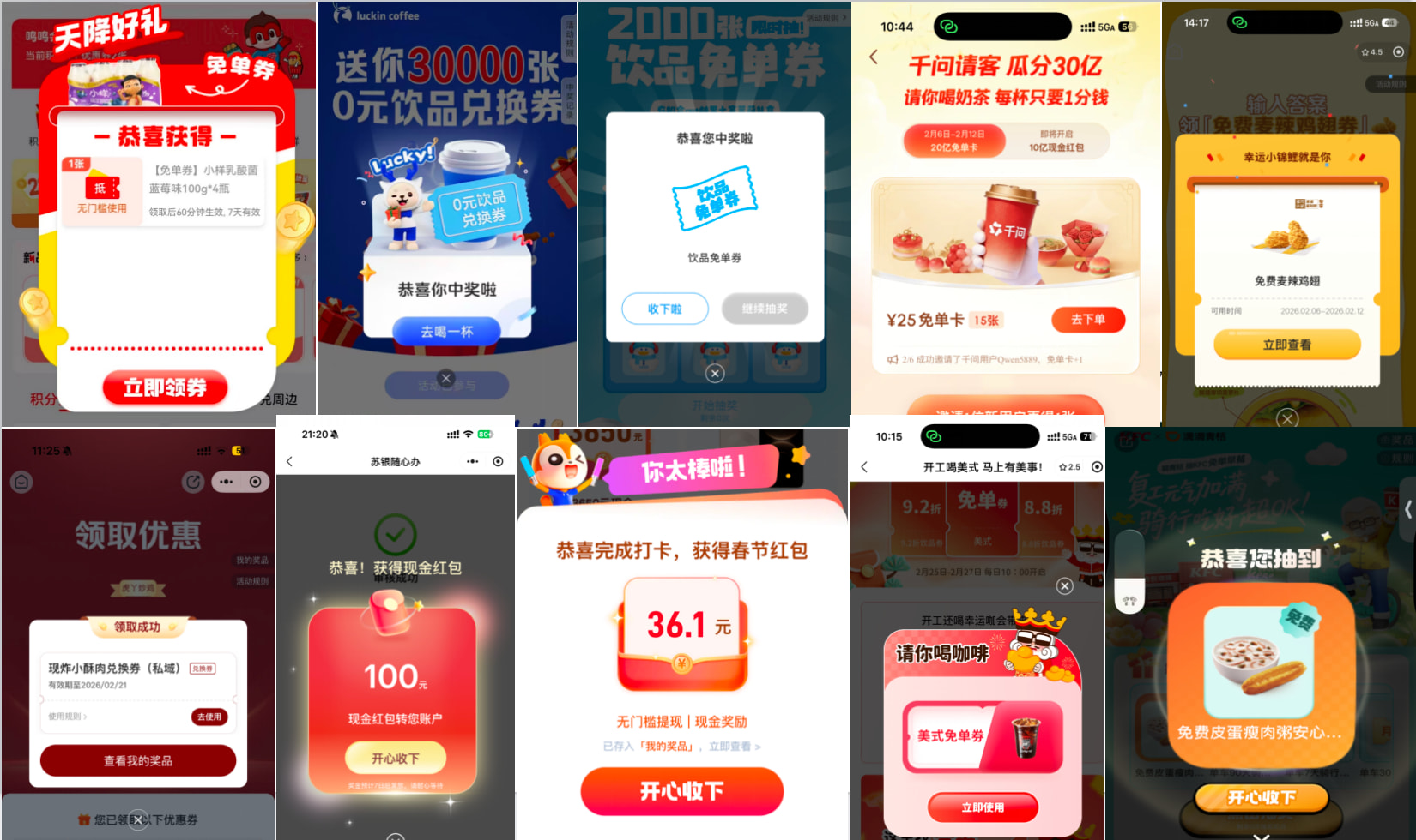 - 各种品牌方活动免单券(瑞幸、蜜雪、麦当当、赵一鸣等等)