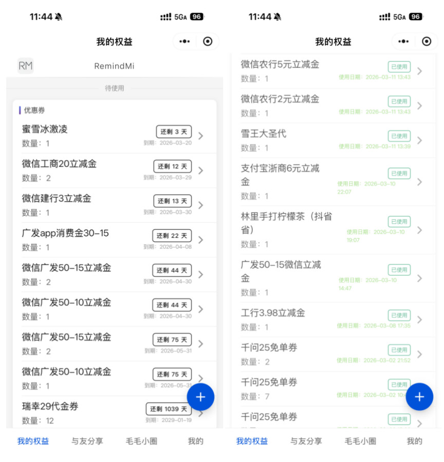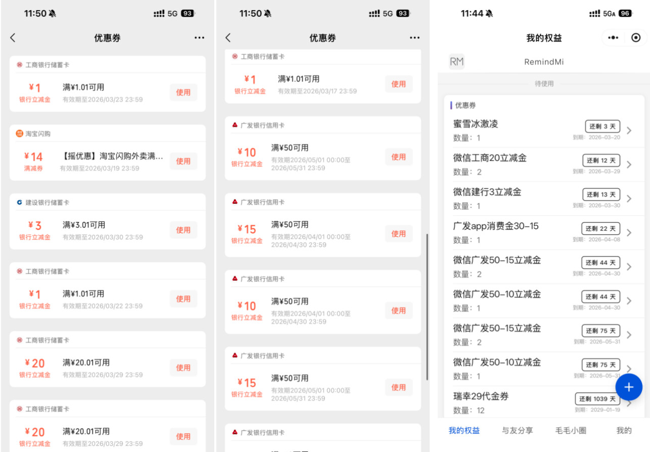 哦对了,这里也可以给大家推荐个好用的权益管理小工具,就是下图这个,我一般领了优惠券就添加到这里,然后这个小程序可以设置过期提醒,我一般设置在过期的前3天提醒我一次,防止权益浪费。