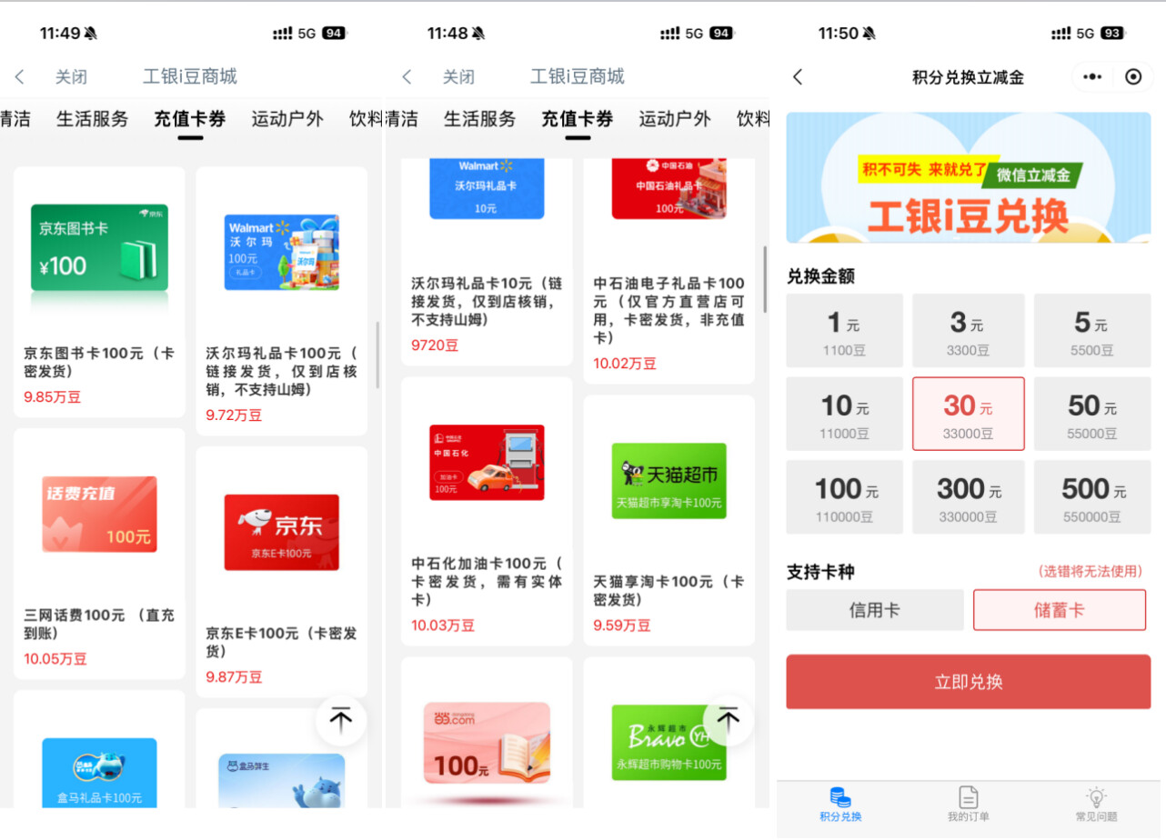 不知道大家有没有了解过工行的i豆,这是可以换钱的哦,比如100元京东e卡、100元盒马卡、亦或者100微信立减金,都是可以通过i豆兑换的。