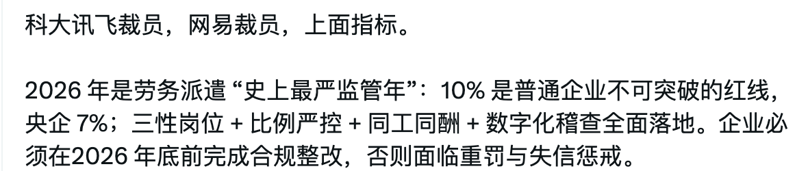 Anano2026-03-18 10:41 #22 image1180×250 27.7 KB 3个回复 ⌃chang_eric ↶ @Anano2026-03-18 10:42 #23 遥遥领先呢 chnmig ↶ @Anano2026-03-18 10:45 #27 我说怎么最近在强推 一人公司, 原来在这等着呢哈哈 Llxcadamas ↶ @Anano2026-03-18 10:46 #29 可惜取消了外包也不会增加正式岗位,只是多了失业的人。 ↓ 跳到帖子♡ 链接 ⋯ ↺ 回复