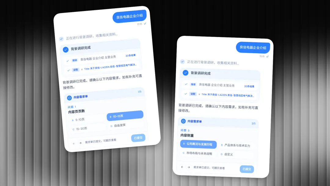 所以,我们让AI做的第一件事,就是像一个专业顾问一样去“需求调研” 。它会先去网上扒一圈相关资料,然后像模像样地问你几个关键问题,让你把真正的需求说清楚。