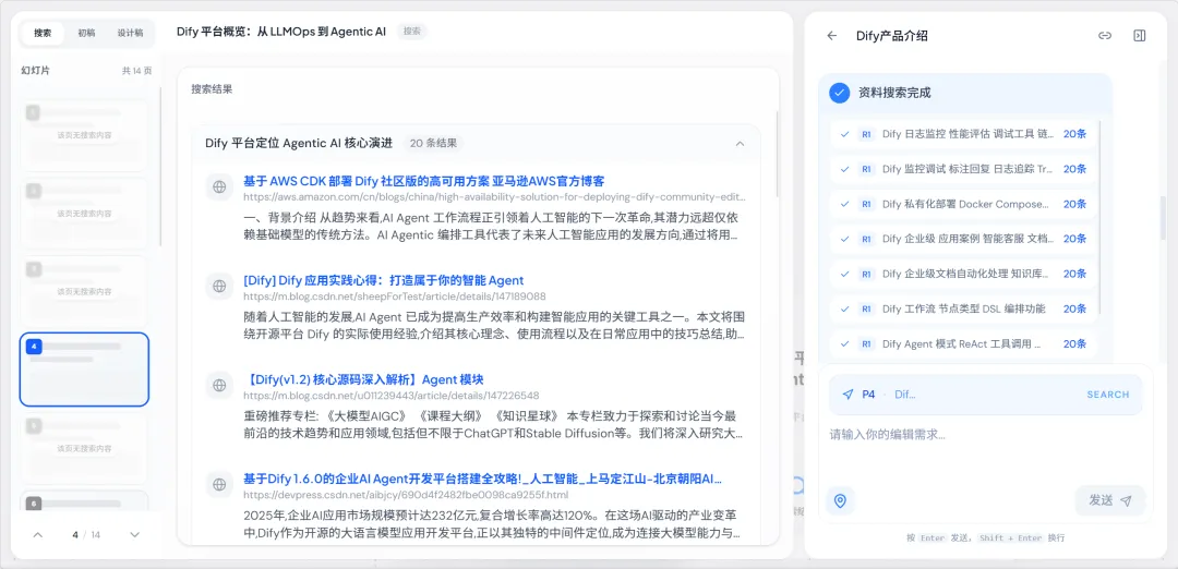 不。你只需要给它一个主题,比如“Dify企业介绍”,然后就可以去泡杯咖啡了。它会像一个真正的专家团队那样,自己跑完从需求调研 → 资料搜集 → 大纲策划 → 生成策划稿 → 生成设计稿的全流程。