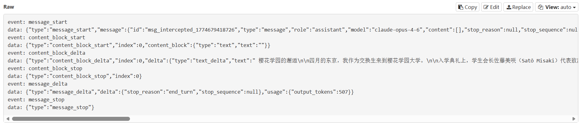 这个模型的答案是很符合opus 4.6的标准的,官渠满血就是这个调性,也没有乱码,问题在于,这个模型吐字的速度非常之快,甚至可以说压根就没有思考,最古怪的是,两次测试的结果是一模一样的,我可不记得我把temperature设成0过。抱着这个怀疑,我对其做了一下抓包。
