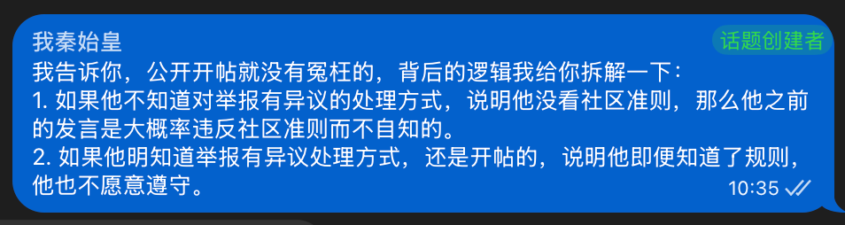 A:希望加入社区共治。每次有人问 “为什么会被举报删帖” 的时候,评论里总有人说 “会有人工审核,审核过了就代表你有问题”。但是众所周知管理员只有几位,随时社区用户量越来越多,审核压力也越来越大,难免有一些失误再所难免。再加上最近社区内对于举报的声音越来越多,所以我认为 “滥用举报” 这个问题需要被解决。